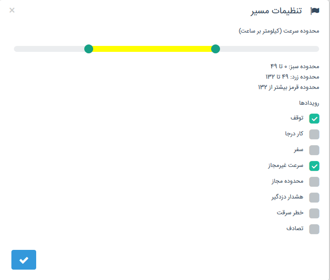 رویدادها: میتوان رویدادهای اتفاق افتاده در بازه زمانی انتخابی را بر روی نقشه مشاهده کرد. برای این منظور کافیست رخدادهای مورد نظر خود را تیک زده و گزینه تایید را انتخاب نمایید.