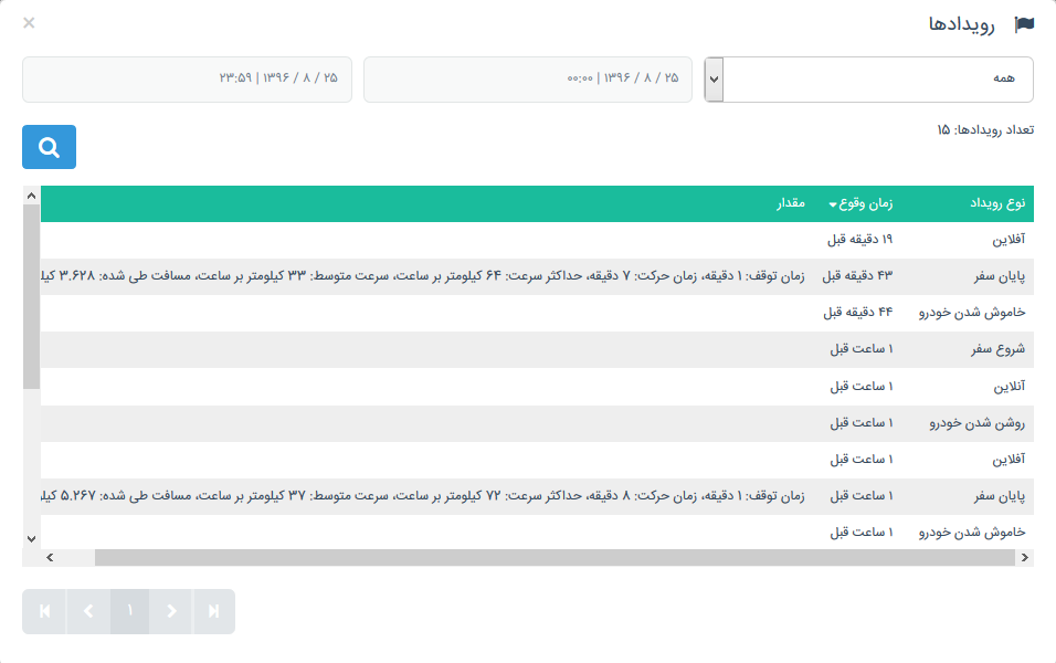 با انتخاب این گزینه میتوانید لیست رویدادهای ردیاب را در بازه زمانی دلخواه مشاهده نمایید. توجه شود که این قابلیت تنها برای ردیابهای راهاندازی شده قابل مشاهده است.