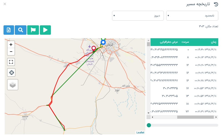 این گزینه برای نمایش تاریخچه مسیر در یک بازه دلخواه حداکثر یک هفتهای استفاده میشود. کاربر میتواند یکی از بازههای پیشفرض (یک ساعت اخیر، امروز و ...) را انتخاب کند یا با انتخاب گزینه "انتخابی" و انتخاب تاریخ شروع و پایان، بازه دلخواه خود را تعریف کند. کاربر همچنین می تواند براساس حداکثر میزان توقف، نقاط ورودی را فیلتر نماید. این مقدار از 1 دقیقه تا 7 روز قابل تغییر است. بدیهی است هرجه حداکثر میزان توقف بالاتر رود نقاط بیشتری فیلتر می شوند. با زدن دکمه جستجو تاریخچه مسیر در بازه انتخابی به نمایش در میآید. توجه شود که این قابلیت تنها برای ردیابهای راهاندازی شده قابل مشاهده است.