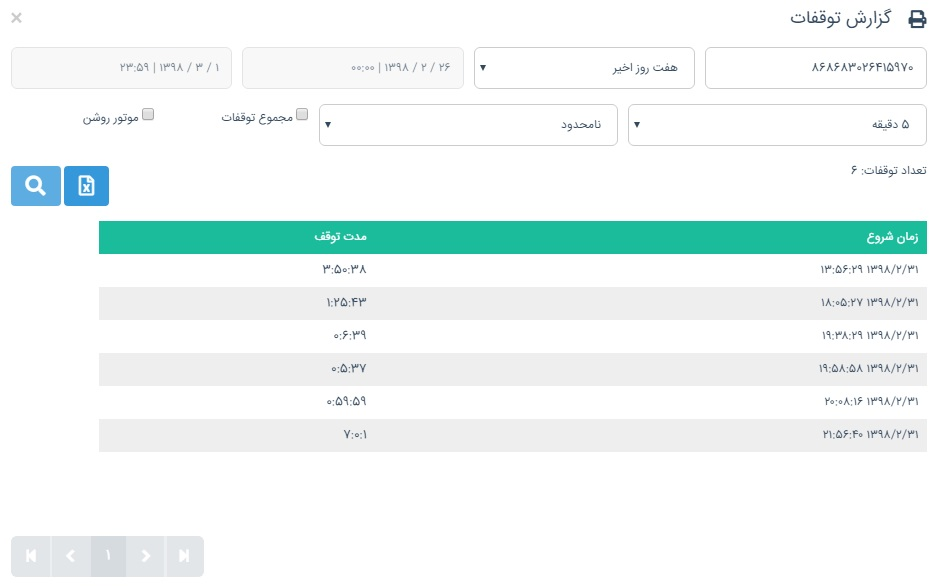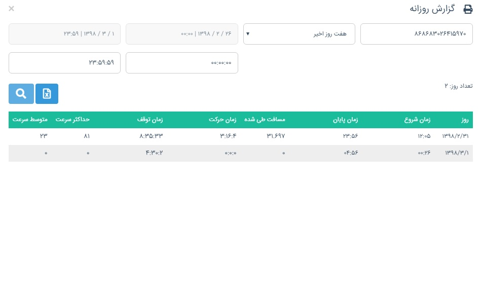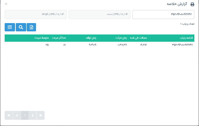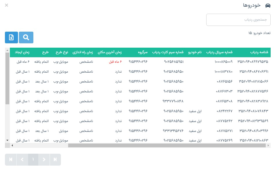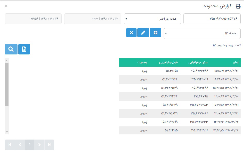 پس از زدن دکمه جستجو، لیستی در برگیرنده اطلاعات ورود و خروج ردیاب از محدوده انتخابی در خروجی ارائه میشود.