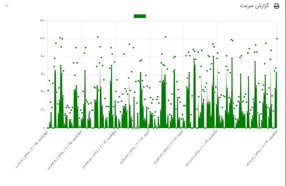 در گزارش سرعت همانطور که در تصویر ذیل مشاهده می کنید پس از تعیین اطلاعات در مورد ردیاب و بازه ی زمانی با کلیک روی این آیکون می توانید نمودار سرعت خودروی خود را در تصویر زیر مشاهده نمایید.