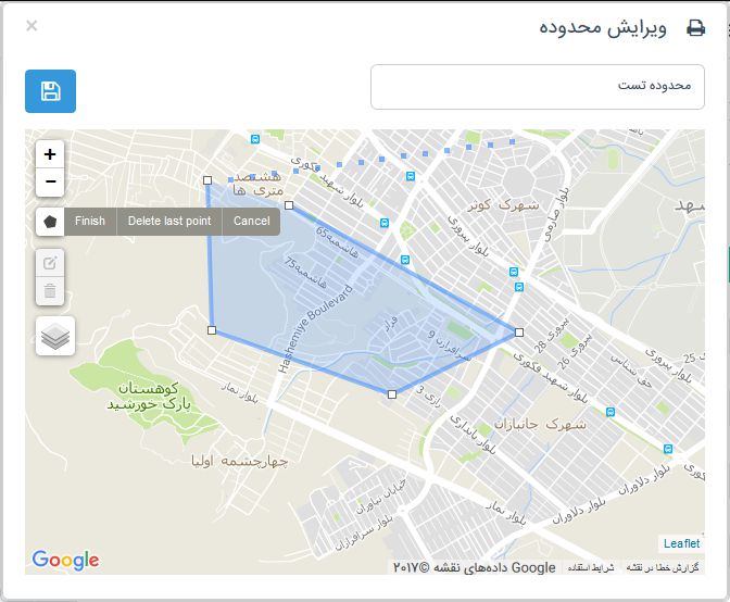 تعریف محدوده: برای تعریف محدوده بر روی گزینه افزودن محدوده کلیک میکنیم. در صفحه جدید نام محدوده را انتخاب میکنیم. سپس با استفاده از گزینه چند ضلعی محدوده مورد نظر را ربر روی نقشه ترسیم میکنیم. دقت شود که بایستی نقاط اول و آخر محدوده بر هم منطبق باشند. (محدوده بسته باشد). با کلیک بر روی محدوده انتخابی و انتخاب یکی از گزینههای ویرایش یا حذف، میتوانیم عمل متناظر با آن را انجام دهیم. با انتخاب گزینه مکان اولیه نقشه به صورتی تنظیم میشود که کلیه محدوده در صفحه قابل نمایش باشد. در پایان با انتخاب گزینه ذخیره، محدوده جدید به لیست محدودههای ما اضافه خواهد شد.