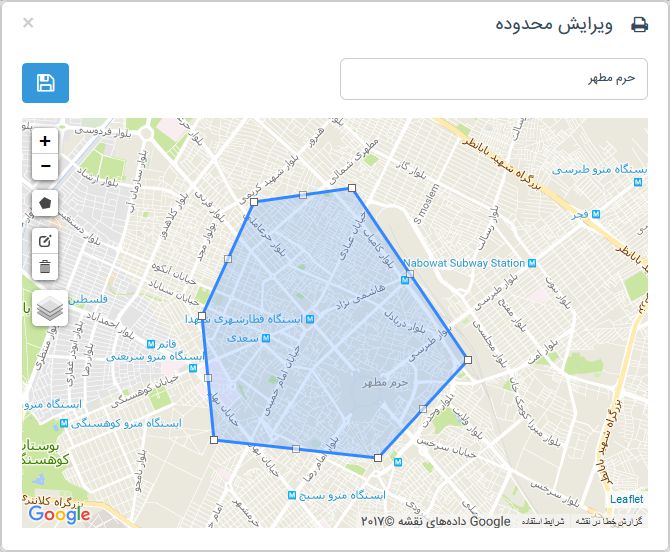 محدوده: محدوده، یک چند ضلعی دلخواه تعریف شده توسط کاربر است که یک حوزه جغرافیایی خاص را بر روی نقشه مشخص میکند.اعمال زیر بر روی محدوده قابل انجام هستند.