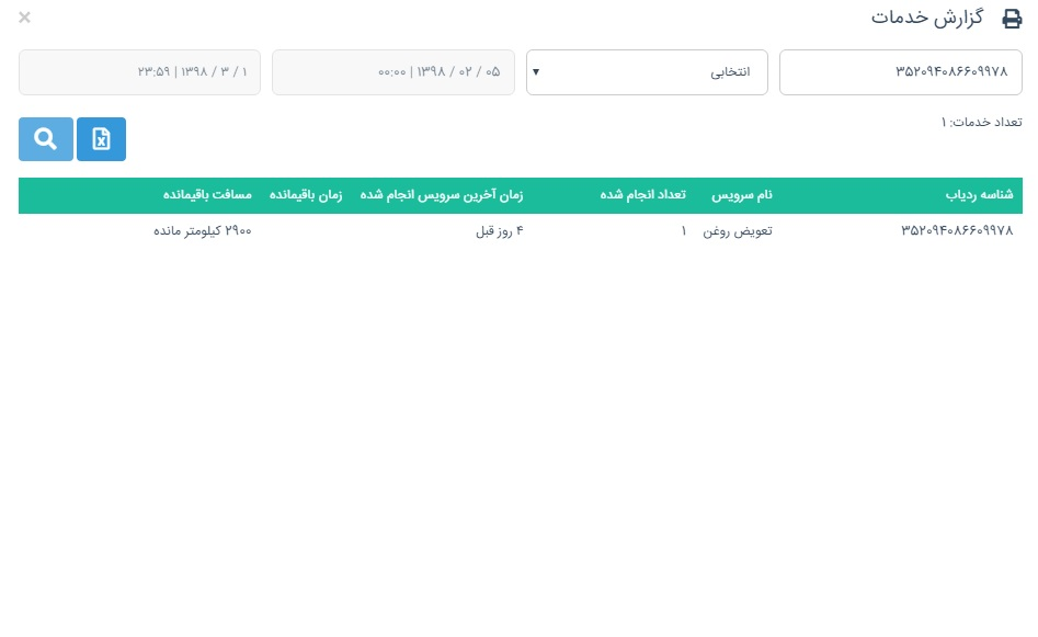 پس از زدن دکمه جستجو، ردیف یا لیستی در برگیرنده اطلاعات خدمات ردیاب یا ردیابهای انتخابی کاربر، در خروجی نمایش داده میشود.