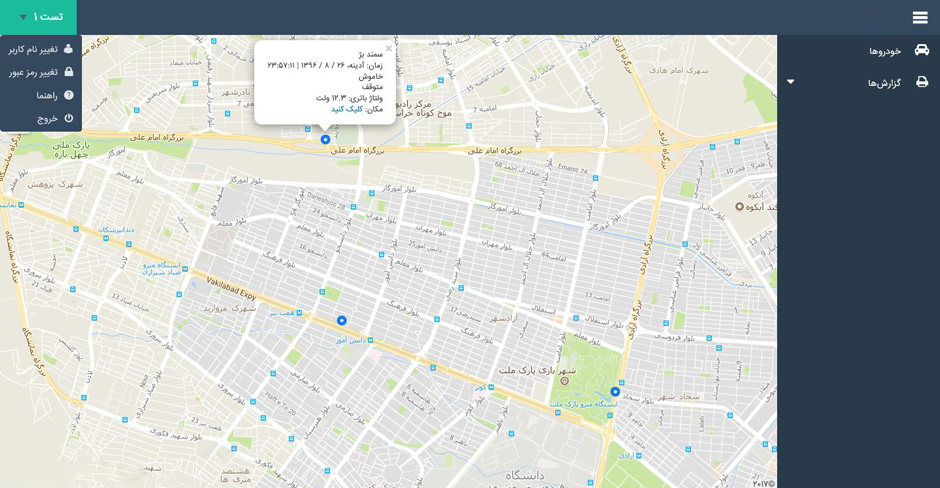 در نقشه موقعیت فعلی، هر خودرو با یک نشانگر آبی رنگ مشخص میشود. با کلیک بر روی هر نشانگر و نمایش یک بالون میتوانید به اطلاعاتی از قبیل نام، زمان دریافت آخرین موقعیت، روشن یا خاموش بودن خودرو و ... دسترسی داشته باشید. دراین بالون با کلیک بر روی مکان، آدرس متنی موقعیت خودرو نمایش داده میشود. در صورتی که زاویه حرکت خودرو موجود باشد، آیکون نشانگر خودرو به یک پیکان جهتدار تغییر میکند.
