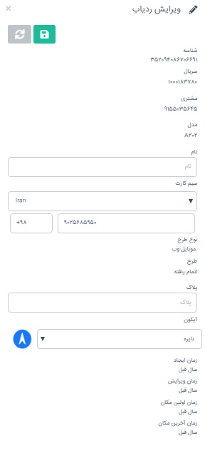 این گزینه برای مشاهده و ویرایش ویژگیهای عمومی ردیاب استفاده میشود. تغییرات کاربر تنها با انتخاب گزینه ذخیره در سامانه اعمال میشوند. در صورتی که کاربر گزینه ریست را انتخاب کند، مقادیر تغییر یافته به وضعیت اولیه بازگردانده میشوند.
